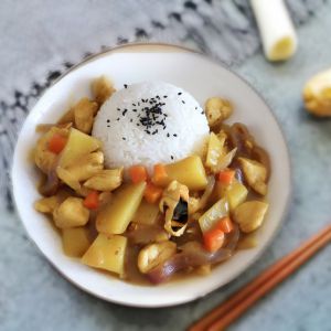 在盘中扣入一碗米饭,撒上少许黑芝麻,再在旁边浇入做好的咖喱鸡,香喷喷的咖喱鸡饭就做好了,感觉每次做多少都会觉得少,孩子永远吃不够