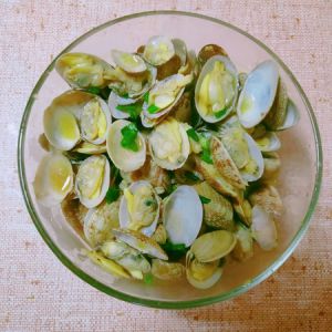 看到花蛤完全打开并流出汁水后,加一点热水,上锅盖小火焖煮,8分钟后转大火收汁,尝下咸淡。(切记要少盐,因为花蛤本身很鲜美)
