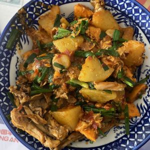 将翻炒好的鸡肉加水,水开后放入土豆和白薯,等待炖到收汁。