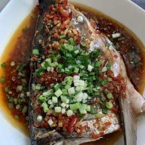 放上鱼头,将蒜蓉剁椒放上面,淋2小勺蒸鱼豉油,将电蒸锅放水烧开,然后将鱼头放入蒸12分钟,取出