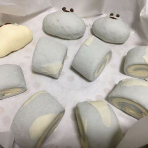 牛奶烧开,加入5朵蝶豆花,等牛奶放凉。捞出蝶豆花残渣。面粉里加酵母,白糖,用蝶豆花牛奶和面。软硬适中,偏软。