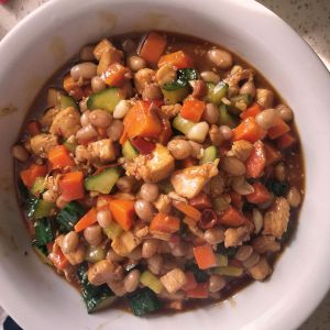 然后起锅烧油,放入蒜干辣椒炒香,放一勺豆瓣酱炒香,再放入胡萝卜丁,鸡胸肉,黄瓜丁炒香