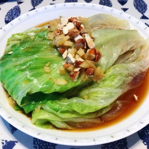 生菜摆盘,倒入料汁,撒上切碎的巴旦木。完美开吃!