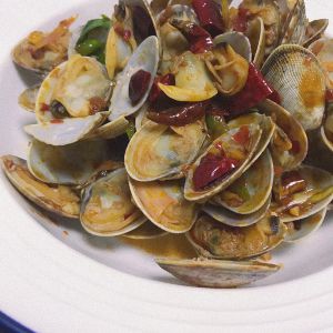 热锅冷油,放入一勺豆瓣酱,几个干辣椒,蒜末爆香,放入焯熟的花蛤,翻炒几下,倒入一勺料酒,一勺蚝油,半碗水(南方吃饭的那种小碗),水沸腾后,翻炒几下,即可出锅。