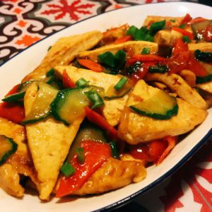 胡萝卜和黄瓜味儿出来 放入煎好的豆腐翻炒~