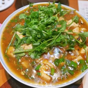 先下辣椒蒜末炒香,放牛肉,加豆瓣酱,炒出香味,然后加水烧开,加豆腐,加平菇,调味(食盐、生抽、蚝油、海鲜酱随君意),勾芡分三次,出锅前洒上青蒜,齐活!