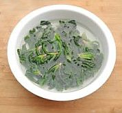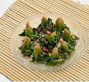 过完冷水的菠菜,捞出来,用手挤干里面的水分,这样调入姜汁后,姜汁才可以渗入到菠菜中,使菠菜更入味。把调好的姜汁倒入到菠菜内。 把爆香的干辣椒和葱花也倒进去,起到提鲜的作用,喜欢辣味的可以多放一些辣椒。把菠菜与调料拌匀,使其入味。 戴上一次性手套,逐个将菠菜叶子顺根茎由里向往裹成卷,摆入盘中即可。