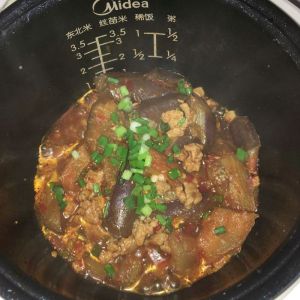 锅内倒豆瓣酱的红油,加入肉末,按下煮饭键,盖上盖,待锅内发出肉末煎炒的声音打开用饭勺搅拌,肉末半熟后手撕茄子入锅,加入两勺豆瓣酱,炒制一会加入水,莫茄子三分之一,盖上锅盖,焖煮10分钟,起锅前加入葱就成啦!甜甜辣辣的很下饭!第一次做就这么成功,不错不错!