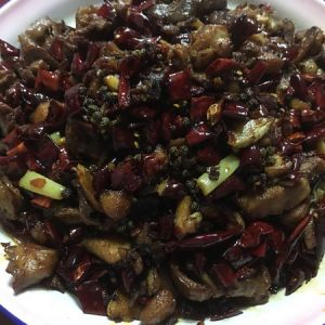 再次倒油,干辣椒,花椒,麻椒,葱,蒜,郫县豆瓣酱爆香后倒入炸好的鸡块,翻炒一下。不要加盐了…因为,郫县豆瓣酱盐味重!