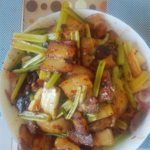 熟了的五花肉切成1CM厚的片,凉锅入油,将肉煎至双面金黄,放入一勺裨县豆瓣,翻炒至红油出,西芹放入,翻炒3分钟,出锅~