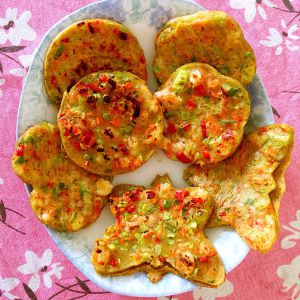 虾丁、胡萝卜丁、黄瓜丁、红椒丁、葱花加入面粉糊中搅拌均匀;