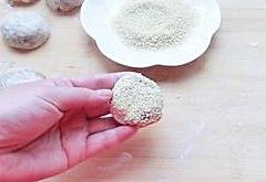 用水将小饼刷出白浆蘸上芝麻,按扁