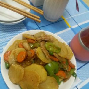 准备开炒。先将土豆片胡萝卜片煎熟,然后加入瘦肉,持续翻炒,加点盐,放入大蒜大火翻遍,爆香,然后加入辣椒,翻炒,加入耗油鸡精,翻炒两分钟出锅,(最好加入少量水闷一下)