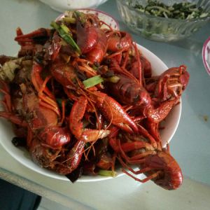 倒入小龙虾翻炒,大概10分钟,最后把葱放入锅内,翻炒1-2分钟出锅