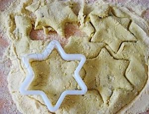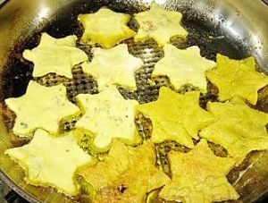 取一块面团压扁,用饼干模子刻成星星状。其实也可以用手团成圆饼状,我刻成星星状就是为了让孩子感觉有点新意。这种南瓜糯米面团没有一点筋性。