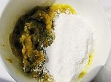 用勺子压成泥,然后往南瓜泥里加糯米粉。糯米粉不要一次加完,每次加一些,防止加多了面团太硬。