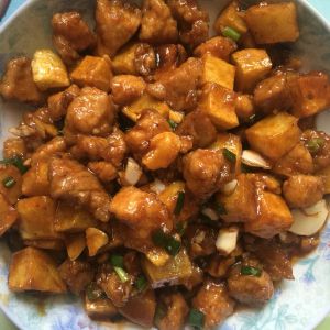 炸好之后,锅中留底油,放入调料汁,再放入土豆、里脊肉翻炒均匀