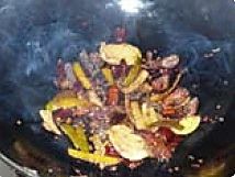 将干红辣椒与花椒放入改小火煸香,再放入橘子皮、话梅、三萘继续煸香后,将牛肉干倒入改中火翻炒匀.