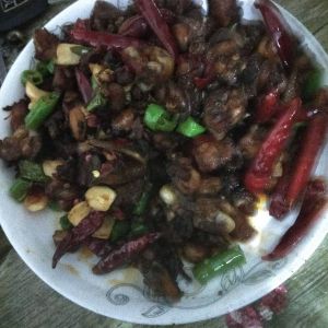 其实正确的做法是用油炸辣椒花椒,捞出辣椒花椒,再炸鸡块,由于第一次买的干辣椒不辣觉得炸过跟不炸差不多。