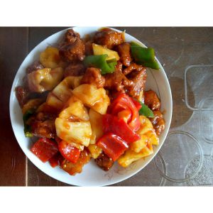 番茄汁烧到冒大泡,把玻璃,肉块,青红椒倒进去快速翻炒,让每一食材都裹上番茄汁,要出国前,淋上一点水淀粉