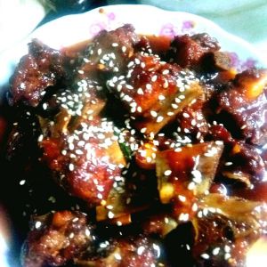 倒去炸好的排骨,放姜,葱,蒜。均匀