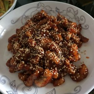 面和淀粉1:1调糊状上油锅炸金黄,番茄酱调糖醋汁勾芡,倒入炸好里脊淋油出锅。