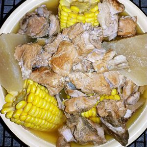 将排骨放入紫砂锅里,加入冷水将排骨淹没。待水开后放入白萝卜块、玉米块、生姜、醋。