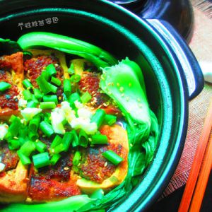 、豆腐煎至两面金黄即可出锅,转移到砂锅中。