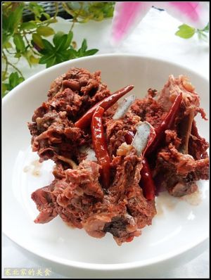 把4块腐乳压成泥,倒入砂锅中,加入腐乳汁,干辣椒,少许盐,搅拌均匀。小火再炖1个小时肉烂脱骨即可。