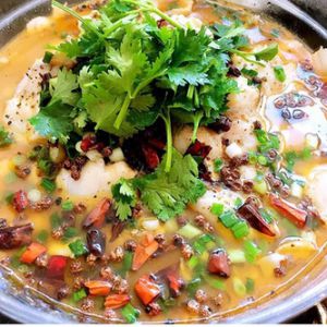 煮好的鱼肉,倒在垫了酸菜的大盘里,洒上碾好的花椒面和辣椒碎,洒上葱花。冷锅入油,放入花椒和辣椒,小火爆出香味后转大火10-20秒(具体看花椒和辣椒颜色,不要糊了),淋在葱花上,放些香菜碎。