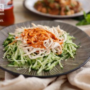 将黄瓜丝放入盘中,放上鸡丝,淋上酱汁,撒上熟芝麻即可享用。