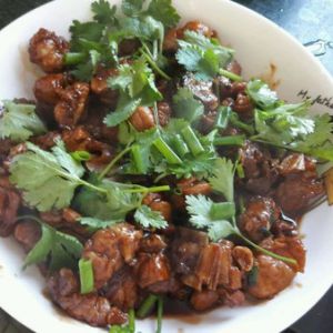 下油放姜片,排骨下锅放老抽炒至偏黄,下糖醋番茄酱,加水燜15分钟左右收汁,最后撒上香菜葱花