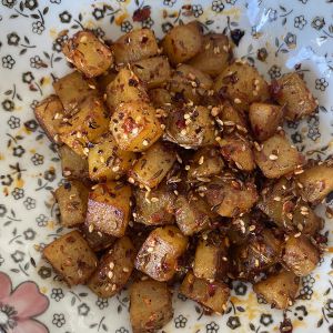等土豆煎黄加入辣椒末、孜然粒、白芝麻、适量盐。