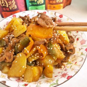 接下来,就是锅烧热下油,加入腌渍好的牛肉片,快速炒熟,倒入之前做熟的蔬菜,拌匀装盘。吃前再撒上孜然颗粒和芝麻粒,完工。