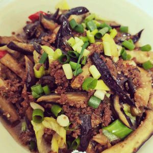 大火炒制茄子软了后,加入料酒,放少许鸡精。最后加入一点热水,焖至收汁。最后出锅,放入葱花。