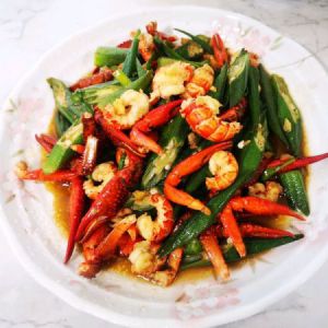 倒入秋葵和小龙虾肉。➕一点点米醋、原汁酱油、麻油、花椒油、蚝油、鸡汁、蔬之鲜调味料,一起翻炒。