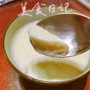 第一层奶皮出现了,从碗边将奶皮挑个洞,轻轻将奶倒回锅中,小技巧,稍微留点奶在碗底哦。