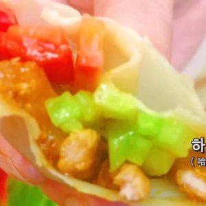 把菜和肉夹到蒸好的饺子皮上,卷起来吃,好好吃