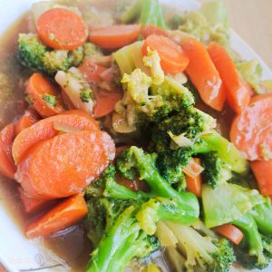 西蓝花掰开。胡萝卜切片,先戳水胡萝卜。再戳西蓝花。放入盐和几滴油(盐是去除脏东西的,油是提亮的)