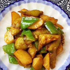 茄子土豆去皮切滚刀块,青椒切块,葱蒜切碎