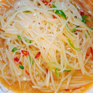 热锅凉油下入葱姜蒜再加干辣椒!少放点水!下入土豆丝!放白糖鸡精生抽耗油炖几分钟放入绿辣椒丝!盖盖焖一会!注意别胡锅!多转动锅