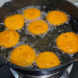 热油烧开加入南瓜饼,中火炸