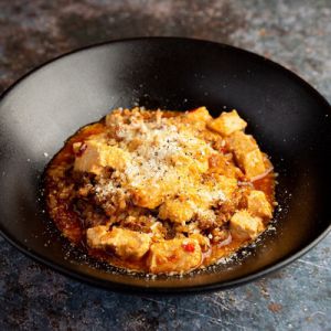 豆腐切小块,冷水加少许盐 下锅 煮沸捞起备用 牛肉末炒香 捞出备用