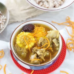 一个小时后打开锅盖,把玉米切成段放进去,盖上盖子继续炖一个小时。