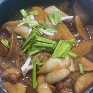 这时候应该差不多了、装入沙锅撒上大蒜、入口即化、这个季节的萝卜烧锅子真的好吃。