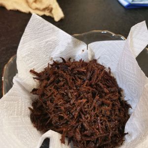 将肉丝成丝,去掉筋膜,锅里导入油,放入麻椒辣椒,油开肉丝放进去煸炒,导入酱油老抽糖,翻炒到肉丝成干。忘了照抄肉丝的照片