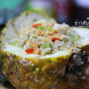 首先下油热锅,放入虾仁炸至变色后捞出;倒入打好的鸡蛋、煎,然后弄散盛出;把红、绿菜椒和米饭倒入锅中不停翻炒,加入鱼露、耗油、黑胡椒粉、咖喱粉、菠萝丁、虾仁,翻炒均匀后盛出装入菠萝即可。最后撒上肉松。