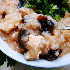 小火熬至米水融合,汤汁浓稠,发粘发黏时,加入肉片。