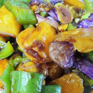 放入炸好的土豆,茄子和青椒,翻炒均匀