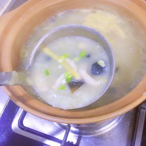 因为是剩米饭,粥很好快煮稠(约20分钟),加入姜丝和皮蛋,继续煮5分钟。